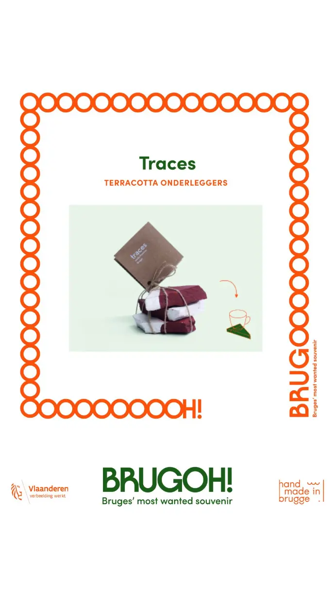 Traces is letterlijk een stukje cultureel erfgoed dat bestaat uit stukjes terracotta die tijdens de renovatiewerken van het Concertgebouw in Brugge gerecupereerd zijn. Gedurende 20 jaar sierden ze de façade van dit internationaal gerenommeerde kunsthuis. U houdt dus een tastbaar stukje recent, Brugs erfgoed in uw handen. Met een nieuw streepje verf is het helemaal klaar om samen met u en uw dierbaren de lijnen van de toekomst uit te tekenen.